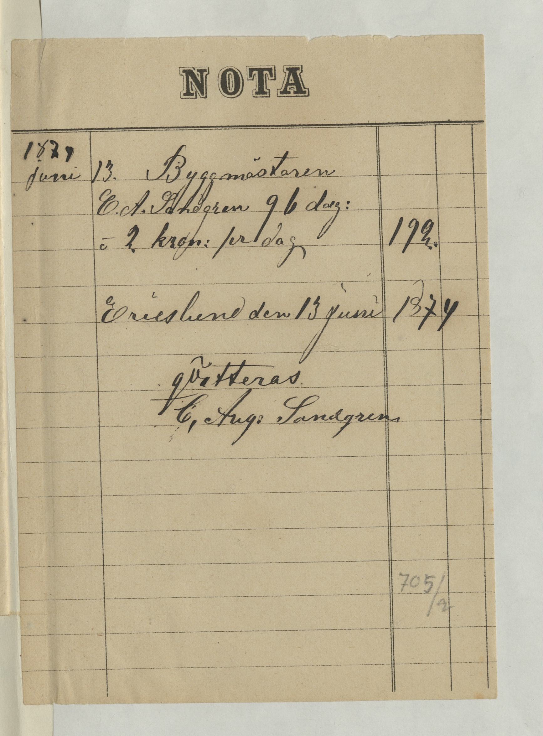 Kvitto från C. August Sandgren, byggmästare, med en summa på 192Kr. Ericslund 13 juni 1874.