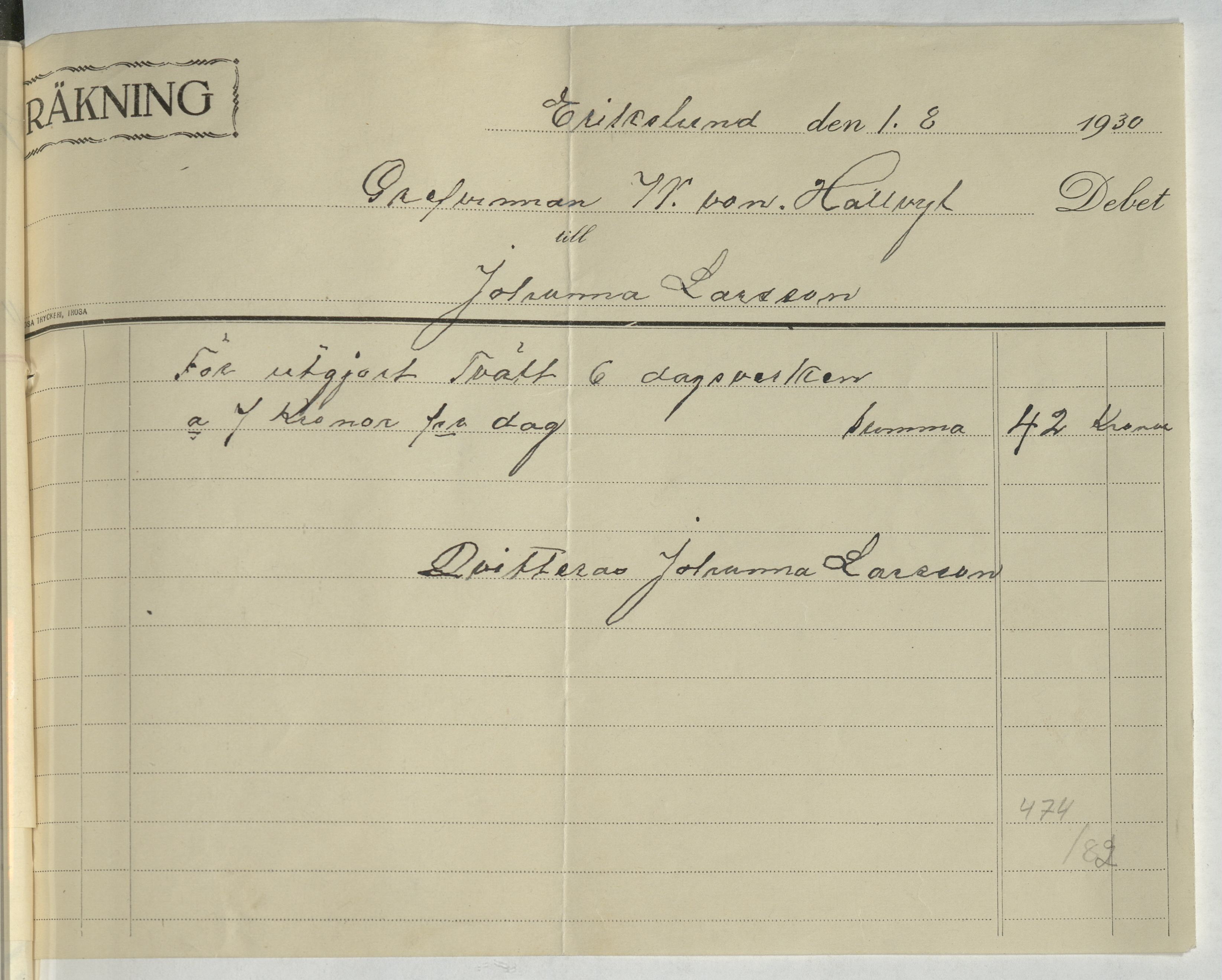 Kvitto från Johanna Larsson i Erikslund. Gällande 6 tvättdagar. Erikslund, 1930.