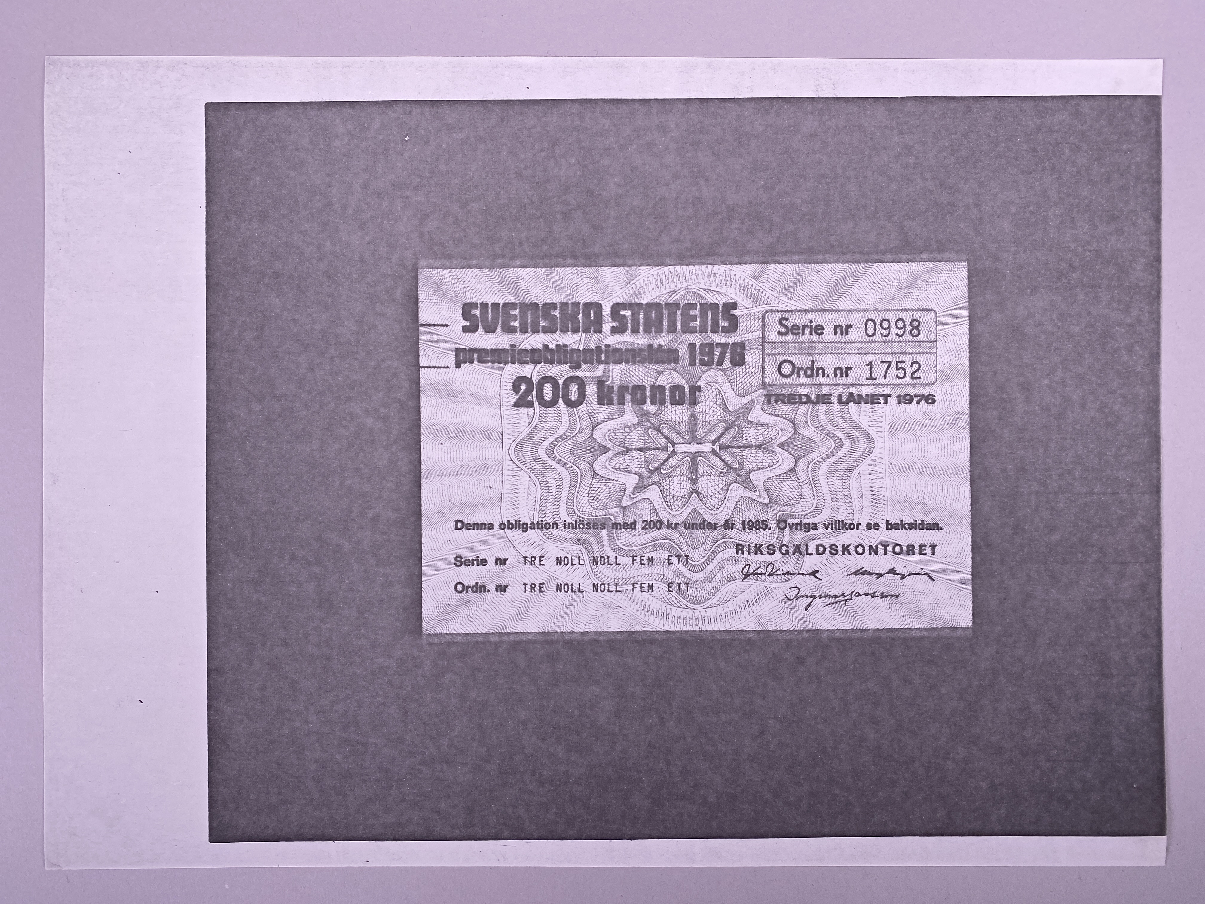 Fotostatkopia på obligation som "inlöses med 200 kr under år 1985". Tredje lånet 1976. Serie nr 0998, ord. nr 1752. Designförslag.