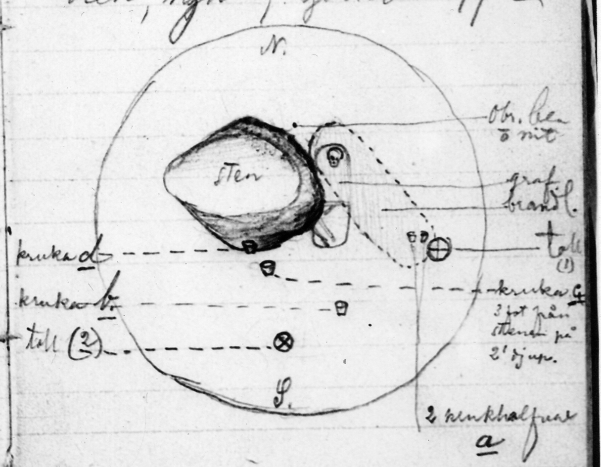 Yttre beskrivning: Diameter 6 meter, Höjd 0,8 meter, Yttre gravskick: Hög, Inre gravskick: Brandgrav, Skelettgrav, Björkögravar