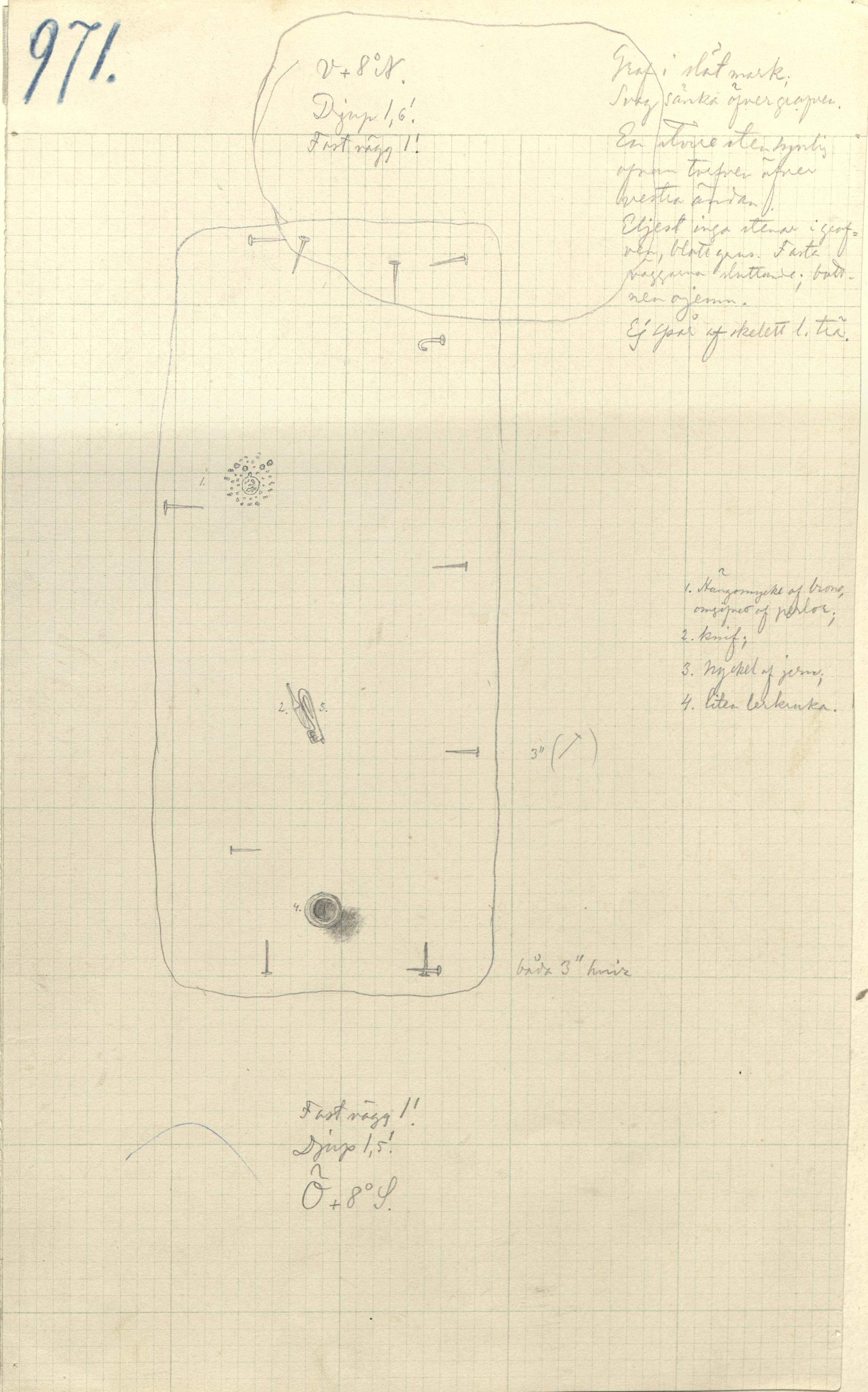 Yttre beskrivning: En fördjupning i markytan, Inre beskrivning: Grop, 1,4 × 0,6 meter, Djup 0,5 meter, Yttre gravskick: Flatmarksgrav, Inre gravskick: Kistgrav, Björkögravar