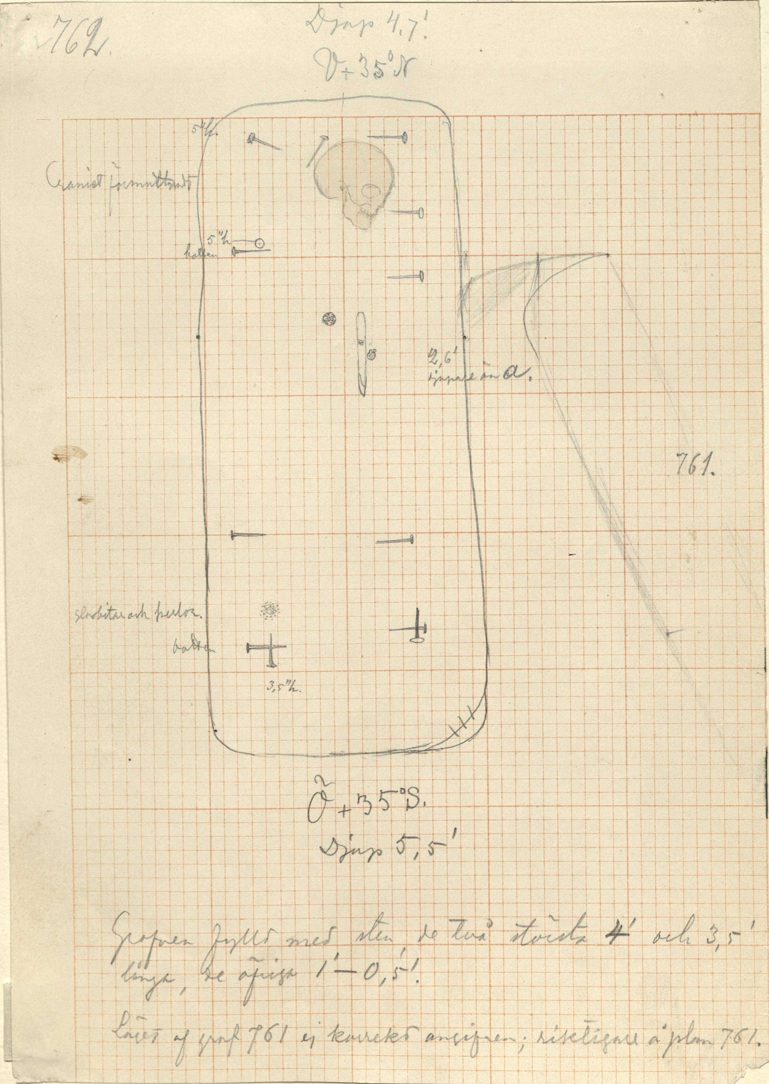 Yttre beskrivning: I samma hög som Bj 761, Inre beskrivning: Grop, Inre gravskick: Kistgrav, Björkögravar