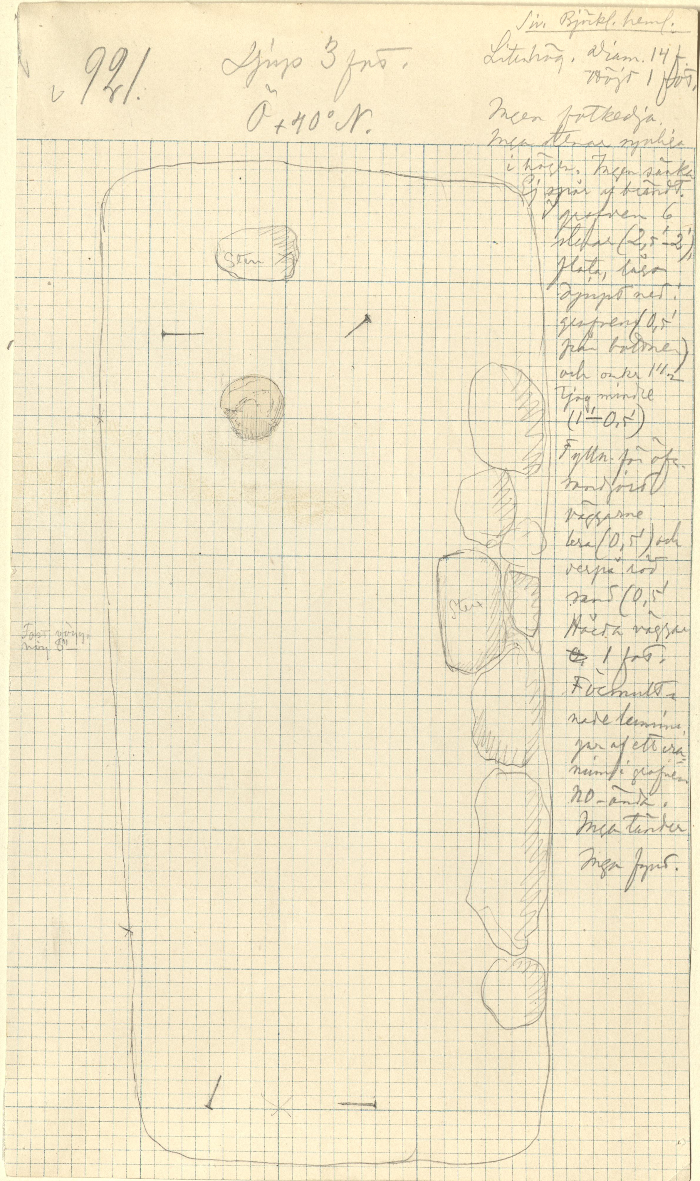 Yttre beskrivning: Diameter 4,2 meter, Höjd 0,3 meter, Inre beskrivning: Grop, 2,2 × 1 meter, Djup 0,9 meter, Yttre gravskick: Hög, Inre gravskick: Kistgrav, Björkögravar
