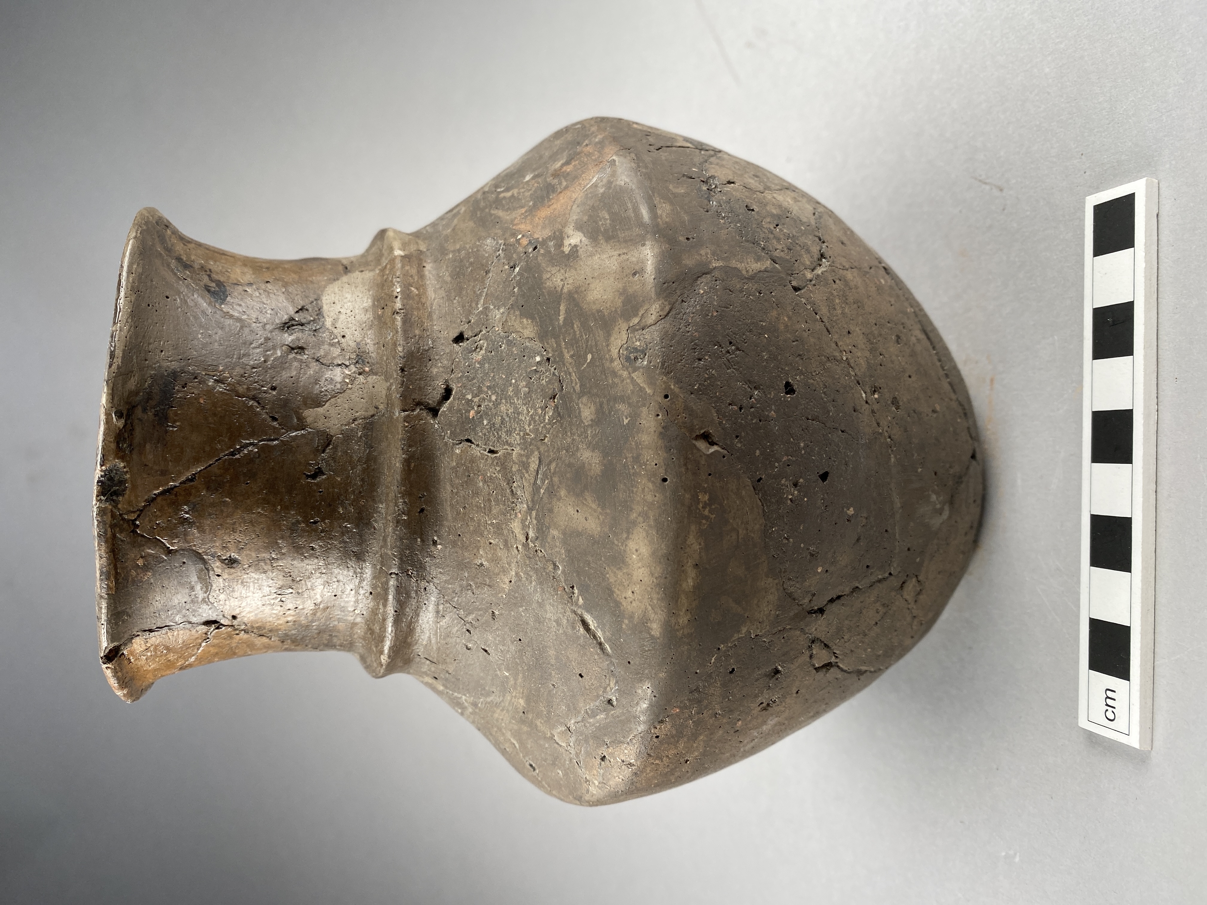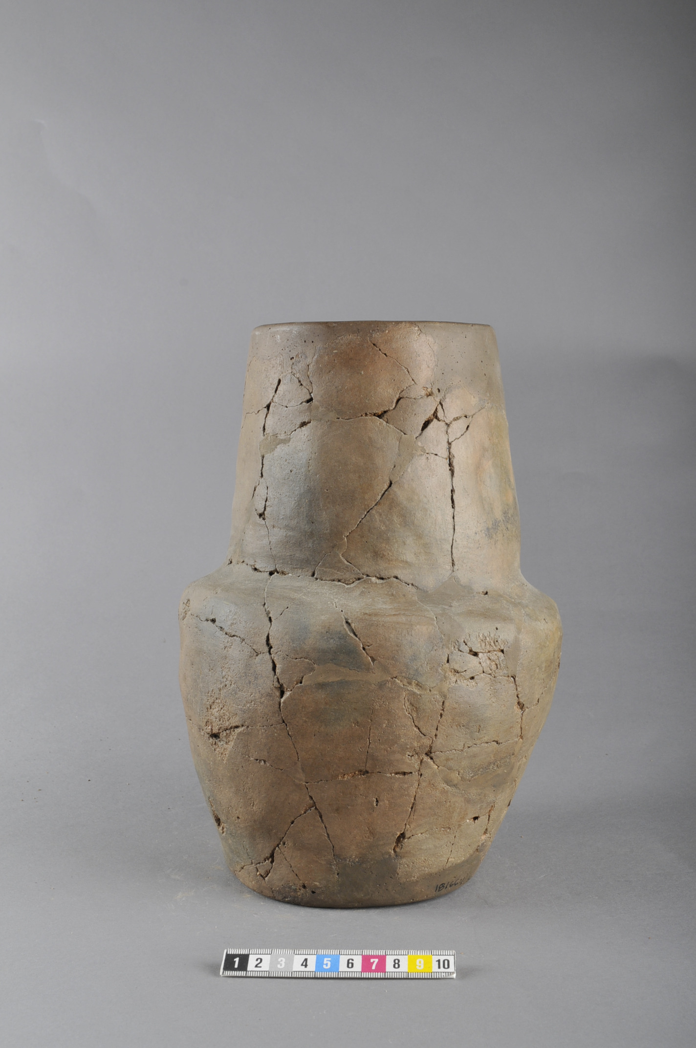 Högt keramikkärl med smal mynning. Mynningen och halsen är betydligt smalare än bukmaximum.