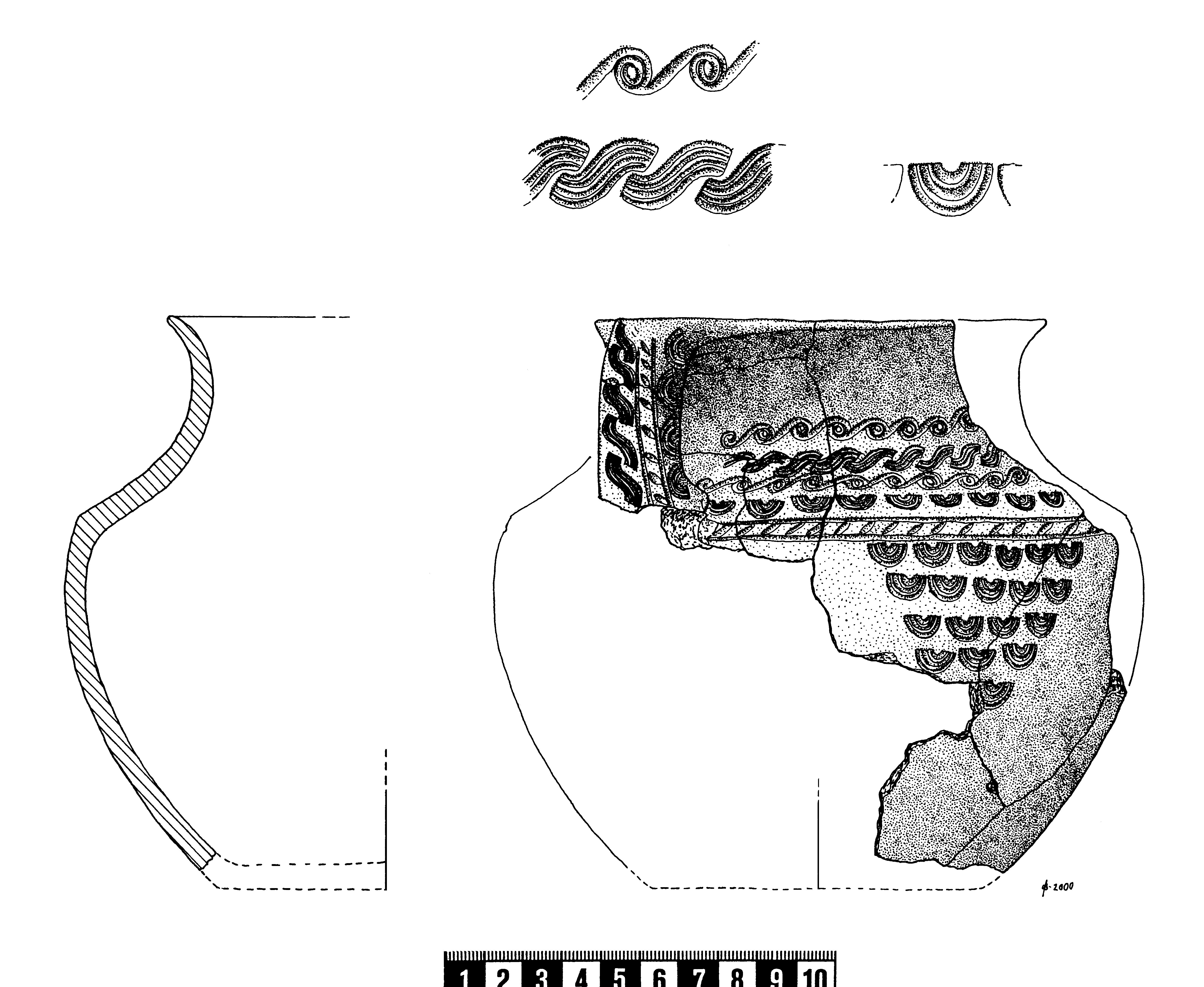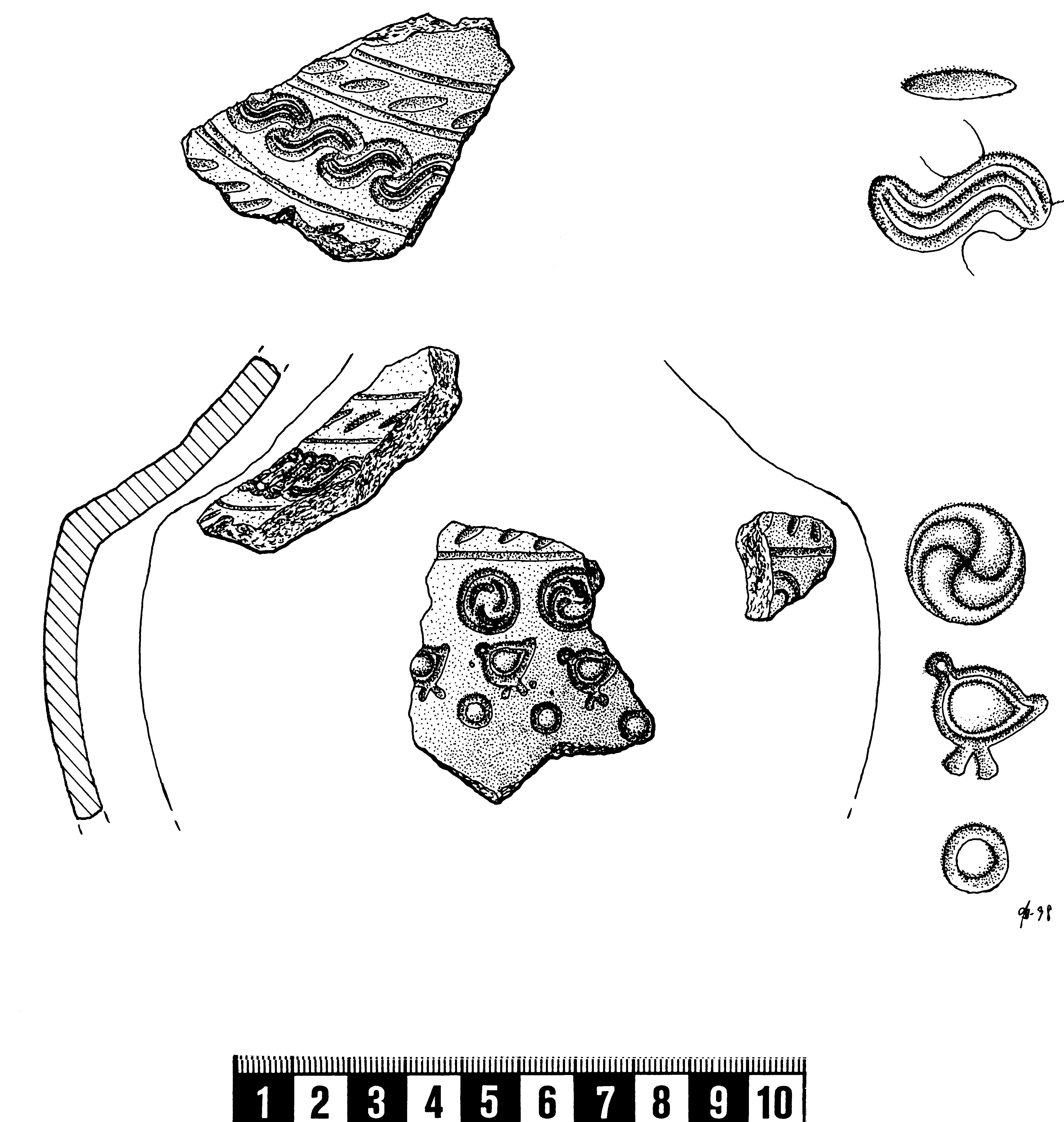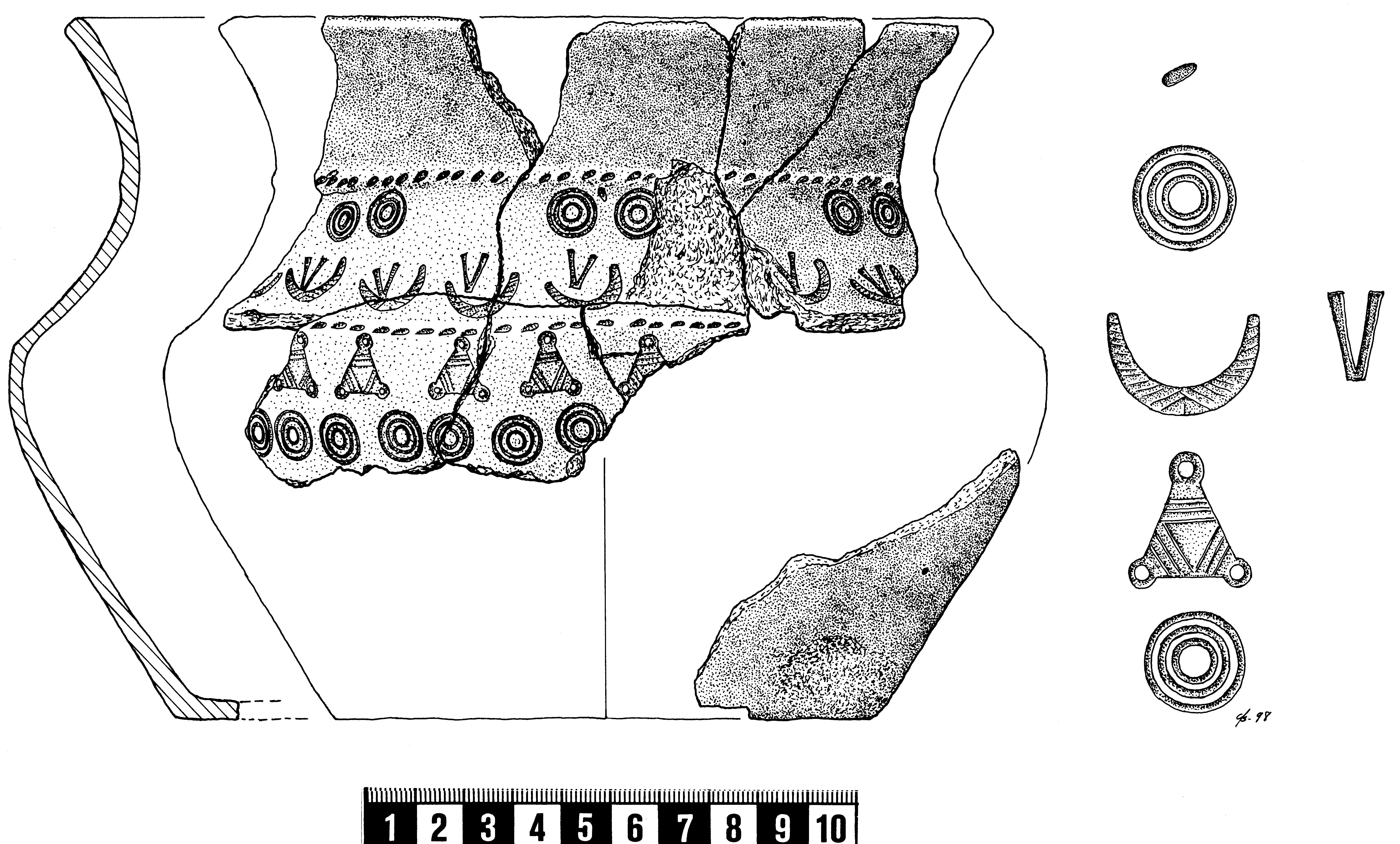 Förekommer bland annat på neolitisk keramik och på kärlen på Gotland och Öland under förromersk järnålder till och med vendeltid. Den senare järnåldersdekoren anknyter till stämplar på metall under samma perioder.
