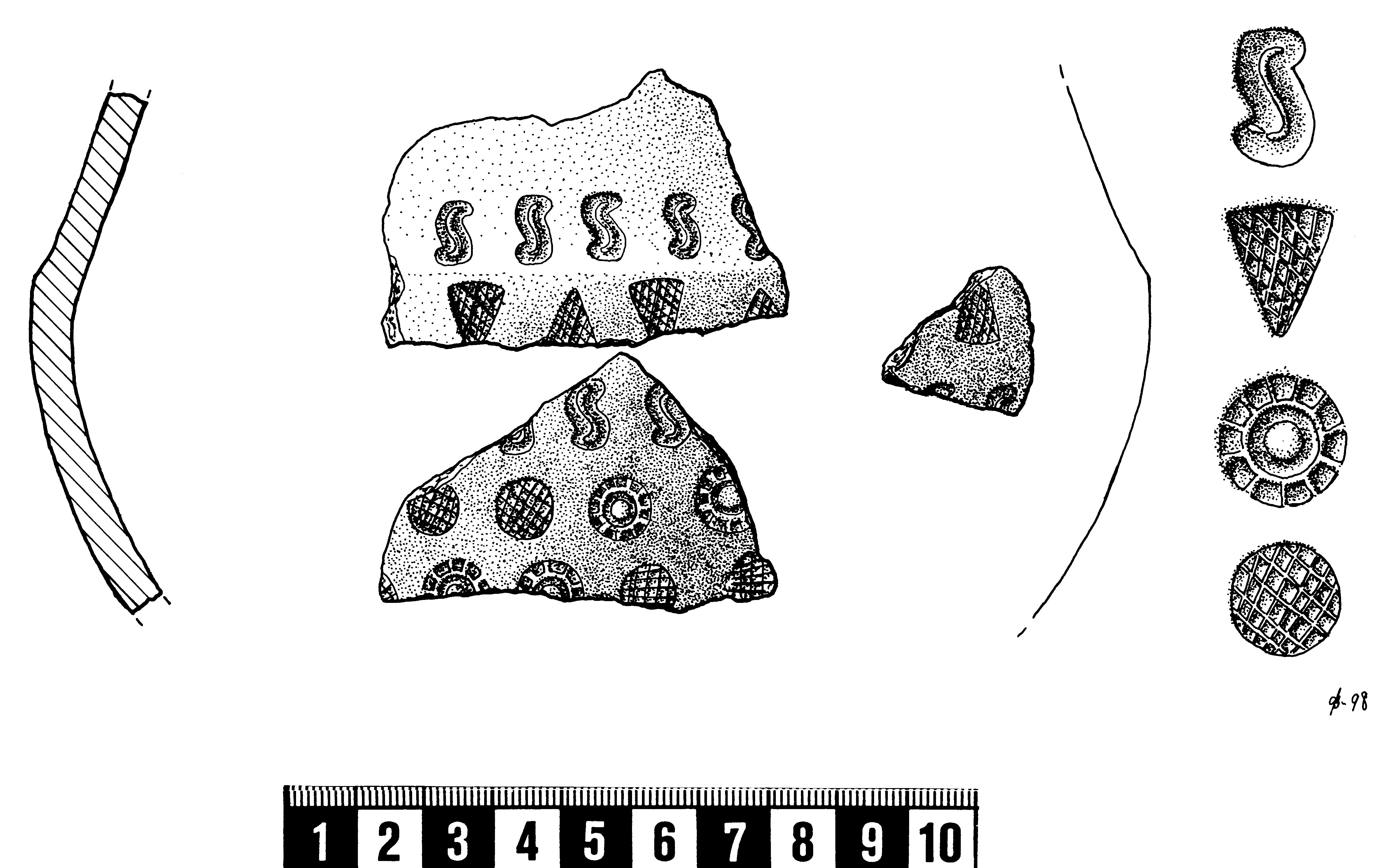 Intryckta motiv av en tillskuren stämpel. Stämplens yttre form kan vara rund eller rundad, tre- eller fyrkantig, mångkantig eller i enstaka fall ha formen av djur- eller människor. Själva stämpeln är vanligtvis 2-20 mm stor. Stämpelns inre kan ha ett abstrakt geometriskt mönster eller i enstaka fall vara mer föreställande.