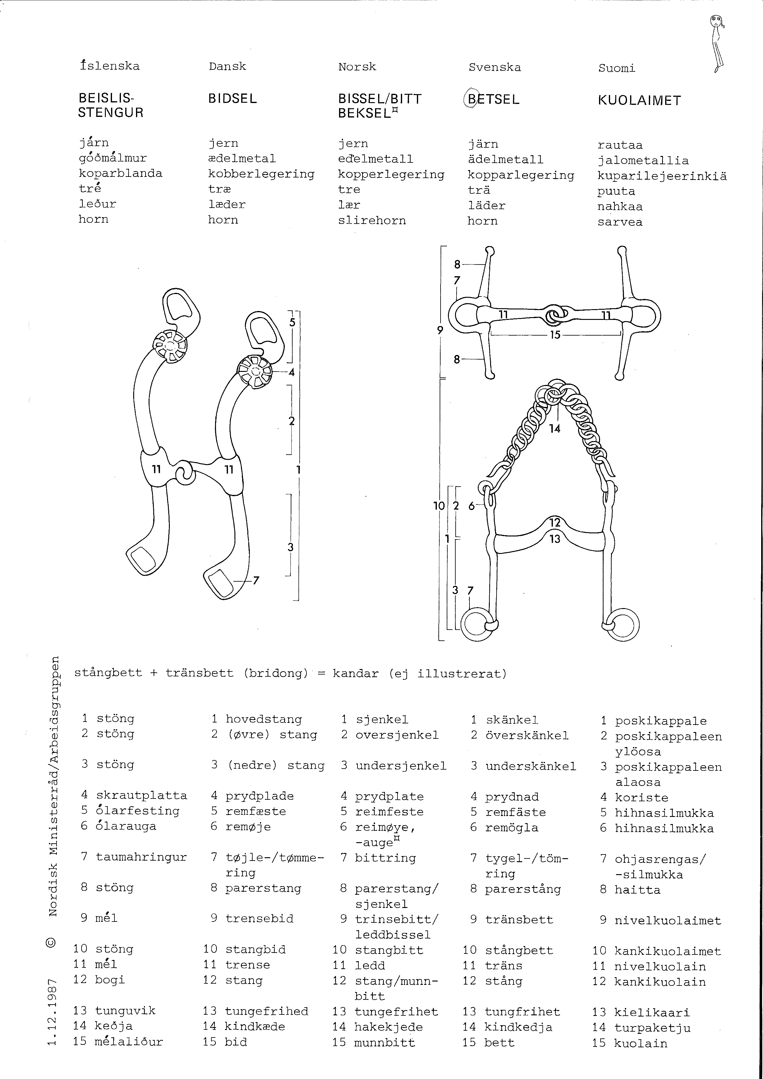 BRÅ: Betsel av brons för häst förekommer från yngre bronsålder. Några bett är funna i Sydskandinavien. Sannolikt importerade från ryttarfolk i Öst. Det rör sig om avancerade stångbett bestående av en ihålig stång med ögleändar. Delar av betsel tillverkade i ben har också påträffats i sydskandinavien. VIK: Betsel. Ett betsel består av munbett, huvudlag och tyglar. I sina huvuddrag har det vikingatida betsel behållit samma konstruktion som är känd i Norden sedan yngre bronsålder och det visar stora likheter med sina närmaste föregångare under vendeltid. Vissa innovationer gör sig dock gällande, så t ex har man under påverkan från magyariskt" håll via det frankiska rytteriet börjat använda betsel med sidostänger. Dessa visar sig i ryttargravar i Danmark och i Sverige på 900-t. Under äldre vikingatid upphör traditionen från vendeltid att göra betsel i unikt praktutförande, till förmån för en mera standardiserad utformning. De under vendeltiden omtyckta förgyllda och rikt ornerade betselbeslagen av brons" inskränktes till ett minimum, och prydnadsbeslagen utgörs småningom oftast blott av remdelarna" och ibland hängande trekantiga plattor. Från äldre vikingatid känner man till några prakt-betsel. med rikt utsirade beslag i Broastil (från Broa i Halla, Gotland, omkr 800) och med gripdjur i ornamentiken.