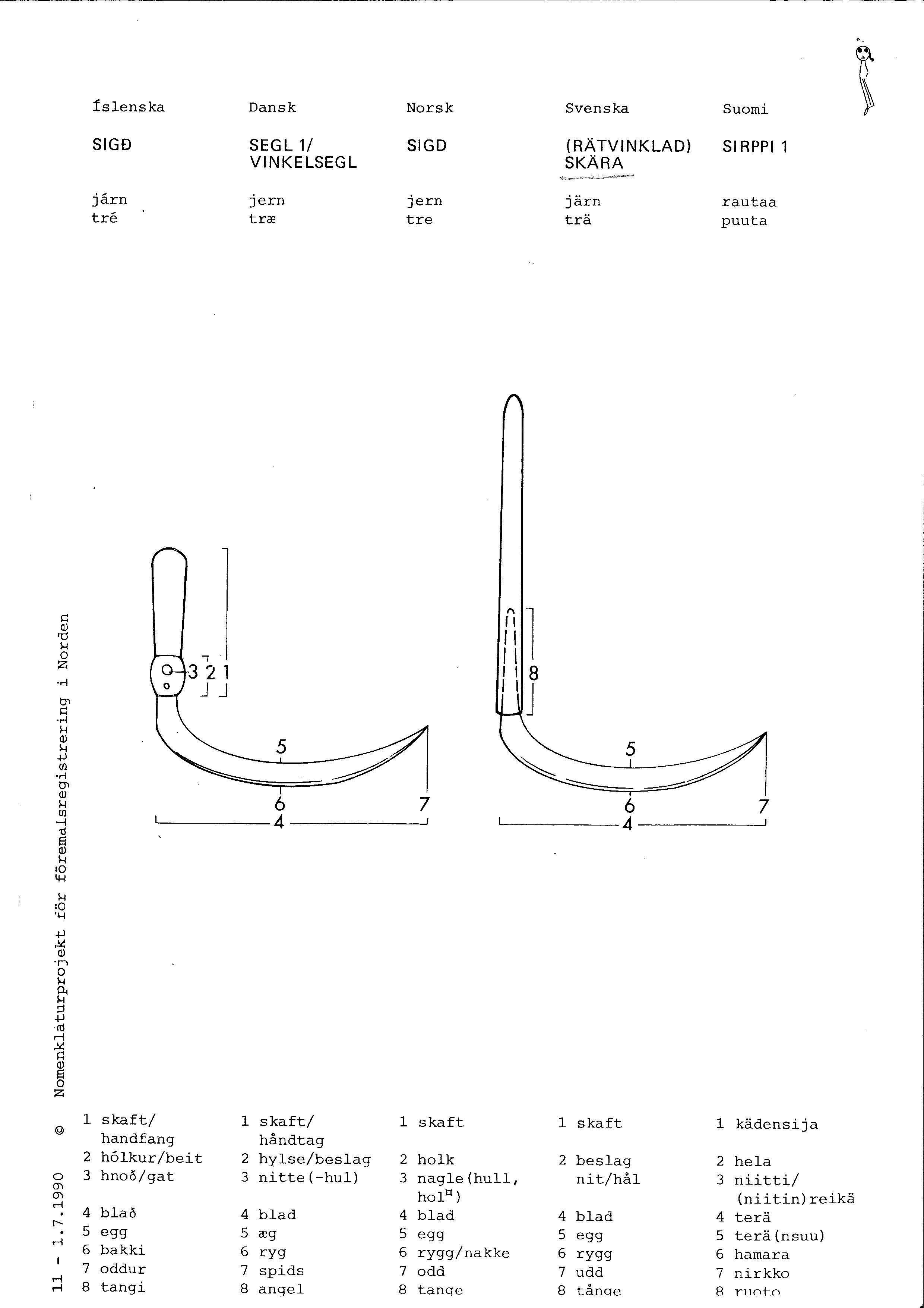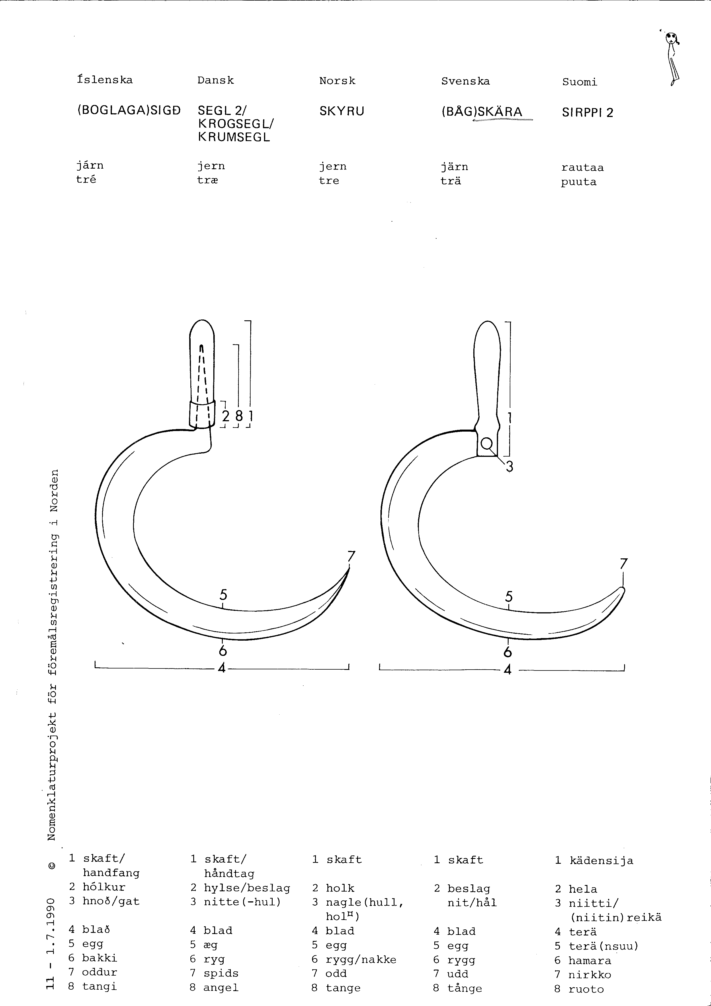 STÅ-BRÅ: Skära med ett eller flera flintspån insatta i ett knäböjt träskaft har påträffats i Norden. Denna form av skära förekom från slutet av stenåldern och trode vara den äldsta formen. Halvmåneformade skäror av flinta i elegant flathuggningsteknik, som också varit inpassade i knäböjda träskaft förekom också. Dessa anses ha varit använda till såväl lövtäkt som sädesavskärning. Flera av dessa skäror är uppskärpta många gånger och har förändrats i formen så att eggen blivit konkav och antagit nymåneform. Skäror av denna typ påträffas ofta i västra Sverige i depåer om 2-8 stycken skäror. I bohuslän har man funnit ett 50-tal dylika depåer. Dessa depåer har tolkats fruktbarhetsfrämjande offer. Flintskäran lever kvar långt in i bronsålder. Då förekommer det även böjda skäror av brons med förtjockad rygg och skaftknopp och en variant med ryggtappar för inpassning i skaft av trä. Skrapor med förtjockad rygg känner man från hela bronsåldern men skrapor med ryggtappar hör till yngre bronsåldern. MED: Skära. De två viktigaste typerna av skäror var vinkelskära och bågskära. På den senare är bladet halvmånformat. Vinkelskäran dominerade under yngre järnålder. Bågskäran fanns i Sverige åtminstone från 1100- och 1200-talet, men fick inte något fullständigt genombrott i hela landet under medeltiden. Under tidig medeltiden skars säden högt upp, under axen. Med bågskärans införande började en gradvis övergång till att skära säden längre ned.