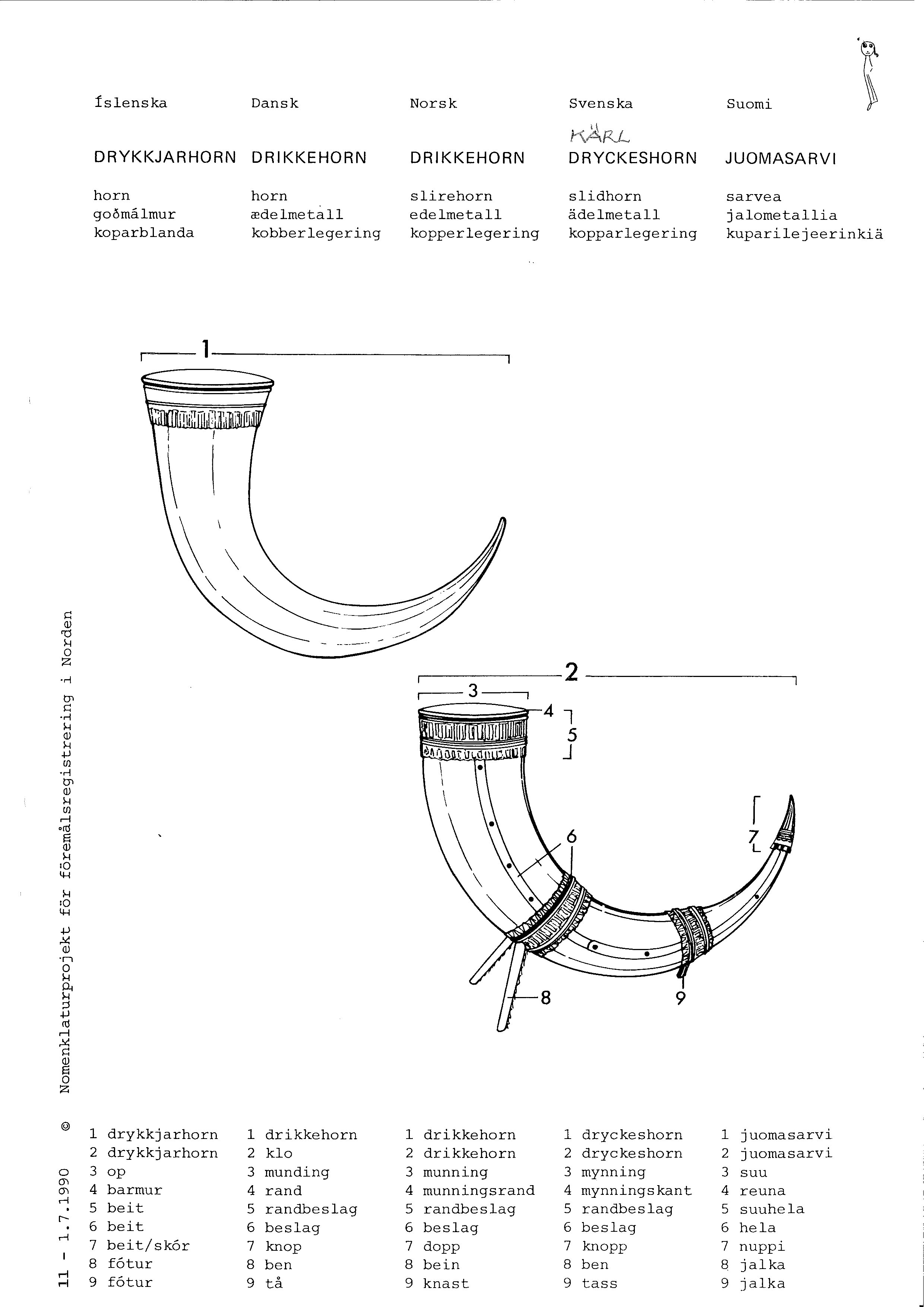 VEN: Dryckeshorn. Caesar berättar i D bello Gallico att det bland germanerna var ett allmänt bruk att dricka ur horn. Från romersk järnålder här i Norden känner vi också en mängd gravfynd, där de döda fått med sig uppsättningar om ett ett par dryckeshorn. Under folkvandring- och vendeltid tillverkades också praktfulla horn horn med rikt ornerade mynnings- och ändbeslag av metall. Normalt användes horn från ko medan lyxexenplaren var uroxhorn. Dryckeshorn tycks ha haft en viktig cermoniell betydelse, från folkvandringstiden känner man exempel på att det till och med funnits exemplar av rent guld. Exempel på vendeltida dryckeshorn finns från Sutton-Hoo - två praktexemplar av uroxe. Från Valsgärde, grav 7, kommer inte mindre än tre horn. VIK: Dryckeshorn från vikingatid är främst kända från avbildningar på bildstenar och runstenar, s k påsyningsbeslag o d. I motsats till förhållandet under romersk järnålder (de första årh e Kr) påträffas dryckeshorn sällan i gravar, även om det förekommer (så t ex i Birka grav 523). Möjligen kan detta bero på, att dryckeshorn som förfärdigats av förgängligt material, nötkreaturshorn, nu mera sällan försetts med metallbeslag, som kunnat bevaras i jorden. Det nämnda dryckeshornet från Birka var emellertid prytt med ett mynningsbeslag av genombrutet silverbleck .